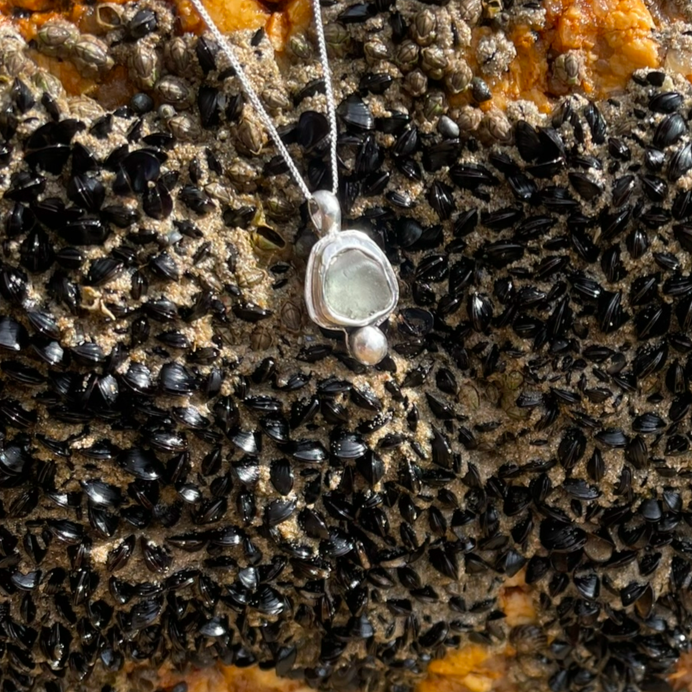 Elevated sea glass necklace in sterling + fine + recycled silver on a sterling silver 48cm chain.